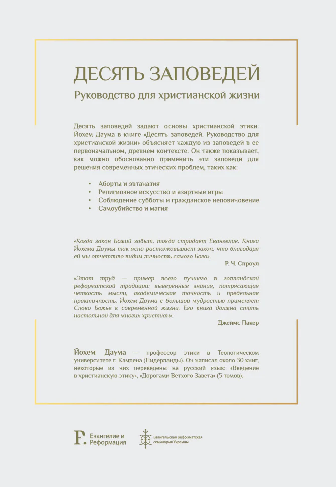 “Этот труд – пример всего лучшего в голландской реформатской традиции: выверенные знания, потрясающая четкость мысли, академическая точность и предельная практичность. Йохем Даума с большой мудростью применяет Слово Божье к современной жизни. Его книга должна стать настольной для многих христиан”. Джеймс Пакер