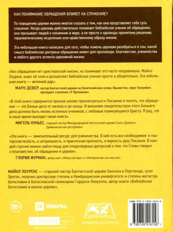 «В этой важной книге Майкл Лоуренс дает ясное представление о библейском богословии обращения. Он не утверждает, будто обращение делает людей хорошими; хорошим можно быть и без обращения. Обращение также не вопрос чисто субъективных ощущений, поскольку можно считать себя обращенным, когда это вовсе не так. Лоуренс объясняет, что обращение исходит от Бога (возрождение) и приносит плод в жизни человека (покаяние и вера). Это изобилие Божьей благодати не только позволяет нам покаяться и уверовать, но и дает возможность стать частью народа, созданного Богом во Христе Иисусе. Одним словом, обращение должно вести к членству в поместной церкви. Я искренне рекомендую эту книгу».