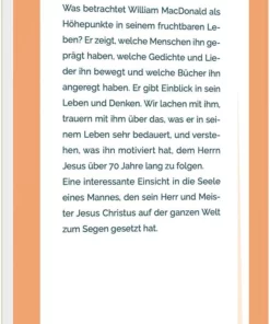 Was betrachtet William MacDonald als Höhepunkte in seinem fruchtbaren Leben? Er zeigt, welche Menschen ihn geprägt haben, welche Gedichte und Lieder ihn bewegt und welche Bücher ihn angeregt haben. Er gibt Einblick in sein Leben und Denken. Wir lachen mit ihm, trauern mit ihm über das, was er in seinem Leben sehr bedauert, und verstehen, was ihn motiviert hat, dem Herrn Jesus über 70 Jahre lang zu folgen.