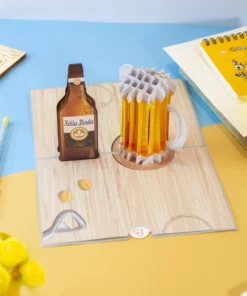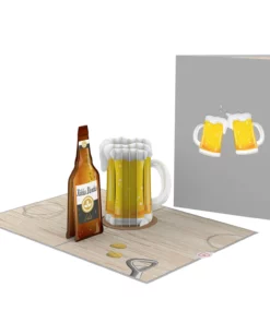 Prost, Prosit und Zum Wohle! Diese Pop Up Karte lässt die Herzen aller Bier-Fans höherschlagen. Beim Öffnen dieser witzigen 3D Klappkarte entfaltet sich ein prall gefüllter Bierkrug mit schäumenden Bier und eine Bierflasche. Auf der Innenseite der Karte – dem Tresen – sind standesgemäß zwei Kronkorken und ein Flaschenöffner abgebildet.