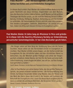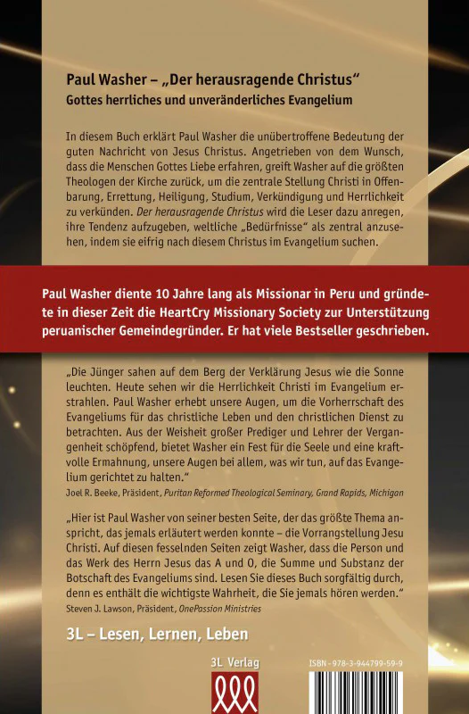 In diesem Buch erklärt Paul Washer die unübertroffene Bedeutung der guten Nachricht von Jesus Christus. Angetrieben von dem Wunsch, dass die Menschen Gottes Liebe erfahren, greift Washer auf die größten Theologen der Kirche zurück, um die zentrale Stellung Christi in Offenbarung, Errettung, Heiligung, Studium, Verkündigung und Herrlichkeit zu verkünden. Der herausragende Christus wird die Leser dazu anregen, ihre Tendenz aufzugeben, weltliche „Bedürfnisse“ als zentral anzusehen, indem sie eifrig nach diesem Christus im Evangelium suchen.