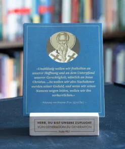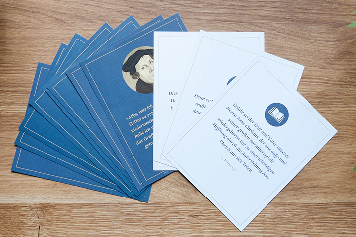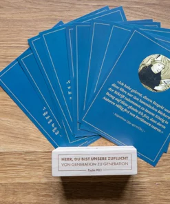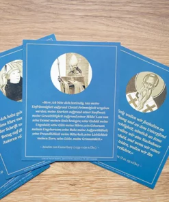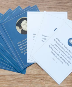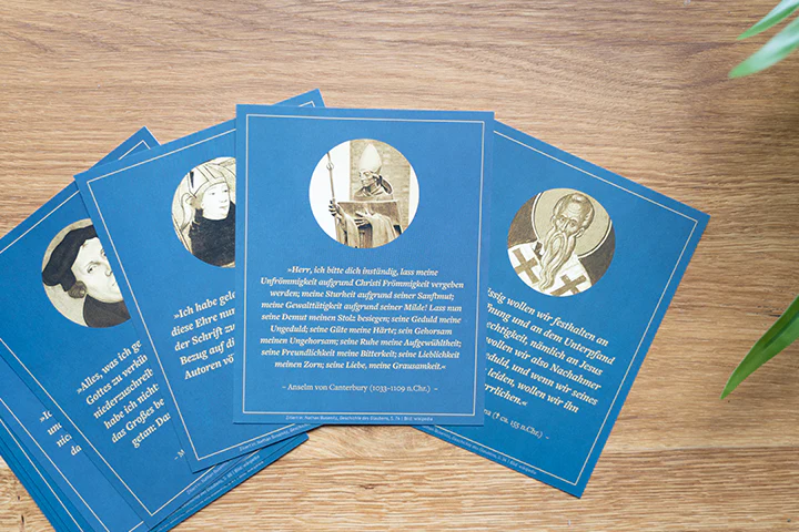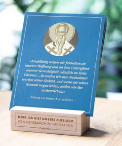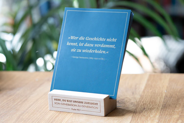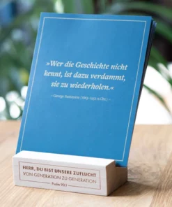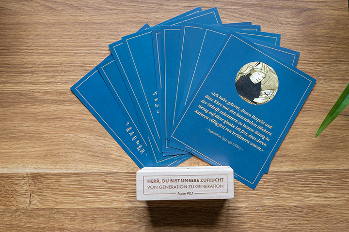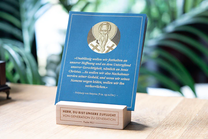Set mit 12 Karten mit Zitaten aus der Kirchengeschichte im Holzaufsteller, aus massiven Buchenholz handgefertigt.