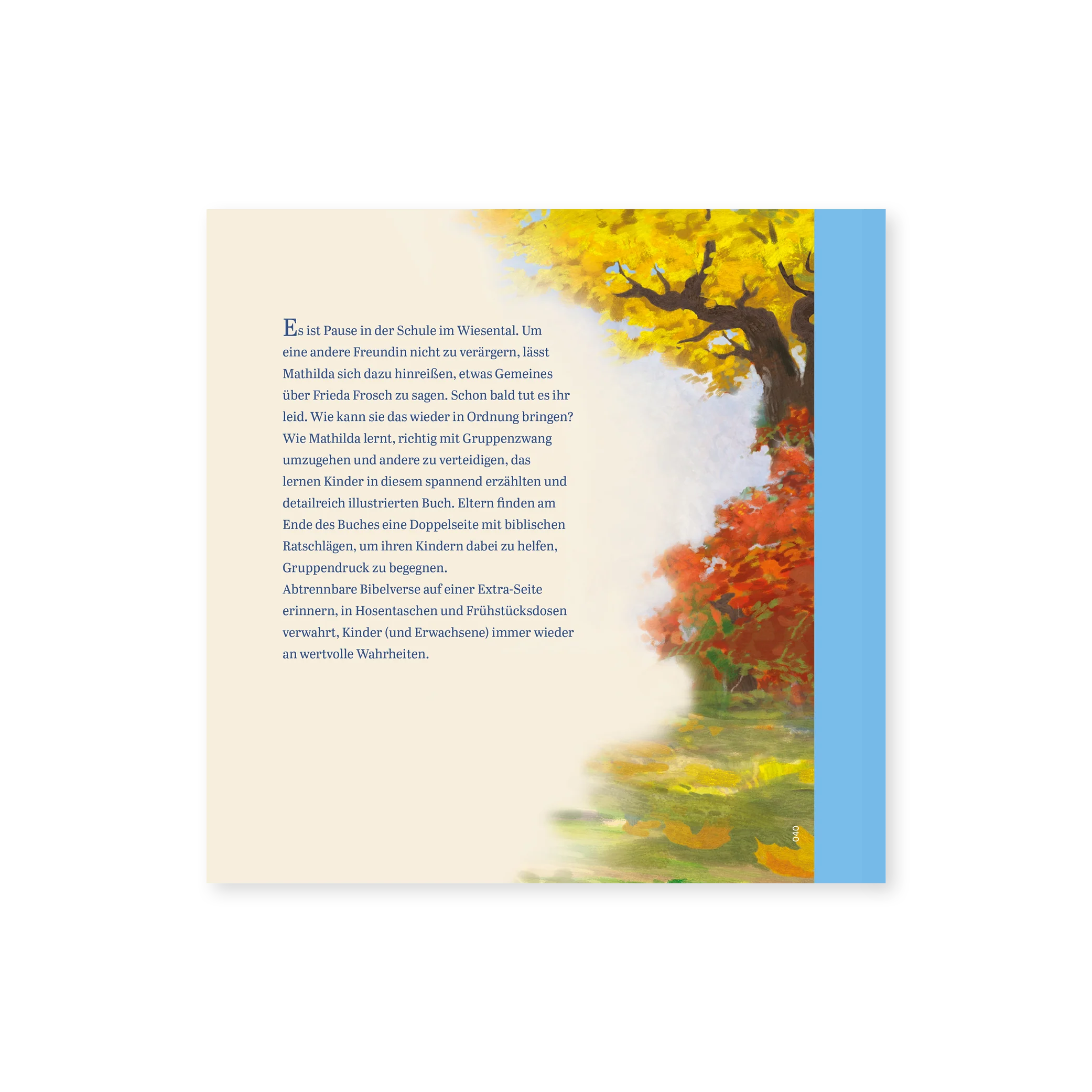 Es ist Pause in der Schule im Wiesental. Um eine andere Freundin nicht zu verärgern, lässt Mathilda sich dazu hinreißen, etwas Gemeines über Frieda Frosch zu sagen. Schon bald tut es ihr leid. Wie kann sie das wieder in Ordnung bringen? Wie Mathilda lernt, richtig mit Gruppenzwang umzugehen und andere zu verteidigen, das lernen Kinder in diesem spannend erzählten und detailreich illustrierten Buch.