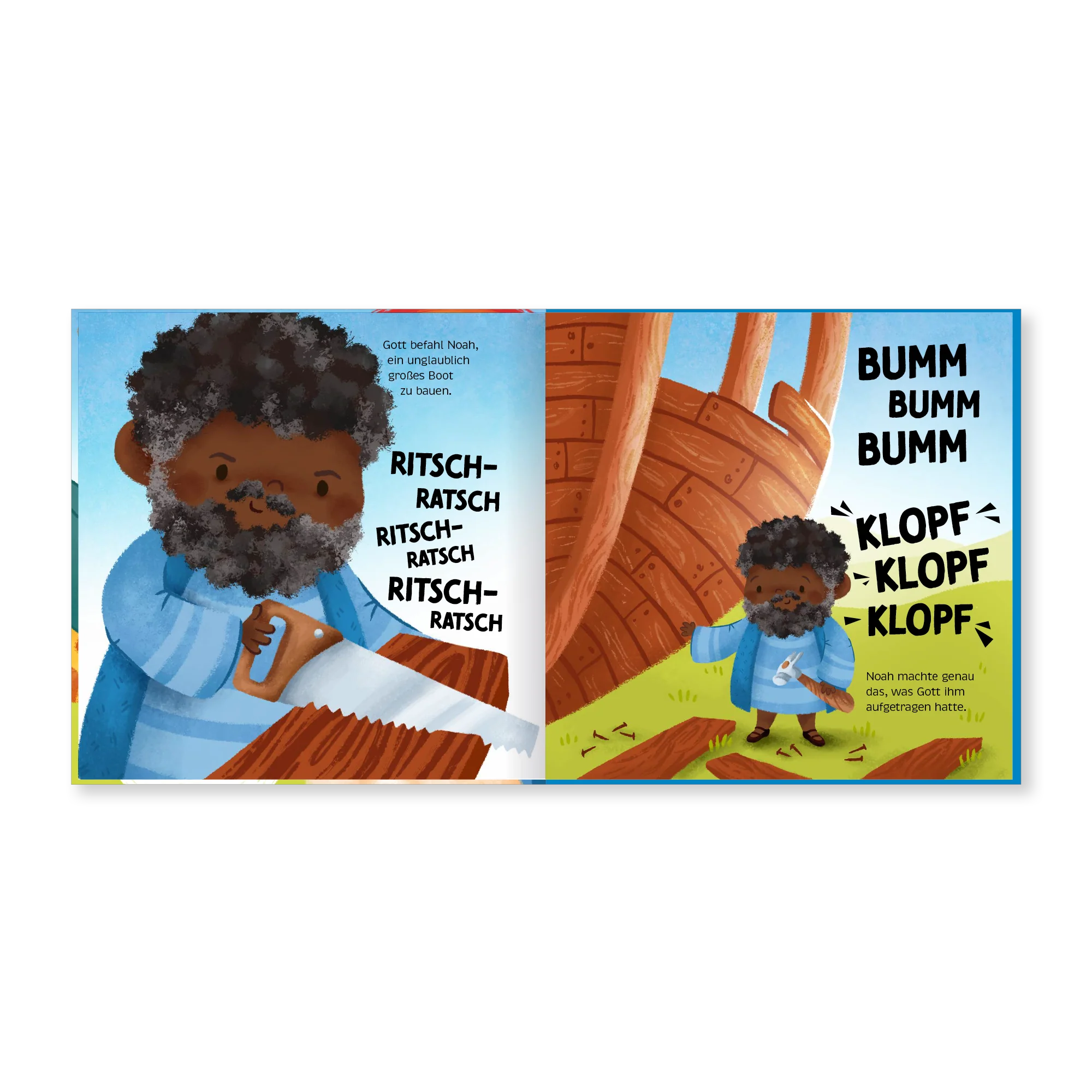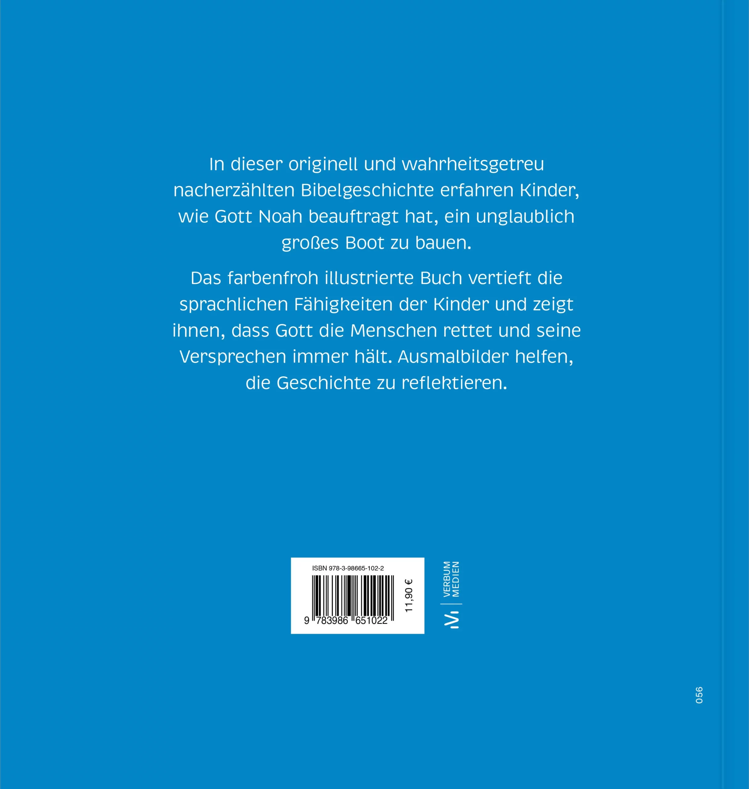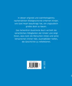 In dieser originell und wahrheitsgetreu nacherzählten Bibelgeschichte erfahren Kinder, wie Gott Noah beauftragt hat, ein unglaublich großes Boot zu bauen. Das farbenfroh illustrierte Buch vertieft die sprachlichen Fähigkeiten der Kinder und zeigt ihnen, dass Gott die Menschen rettet und seine Versprechen immer hält. Ausmalbilder helfen, die Geschichte zu reflektieren.