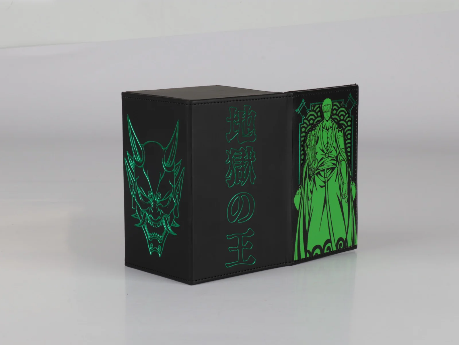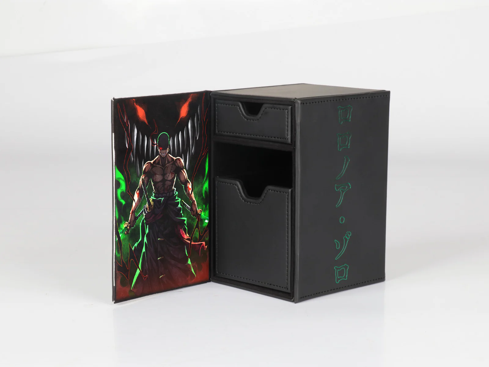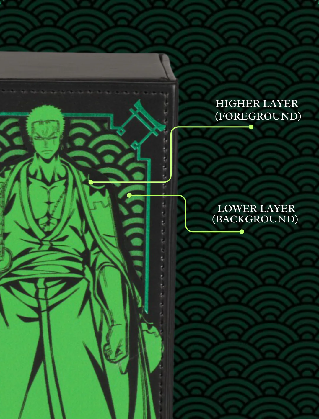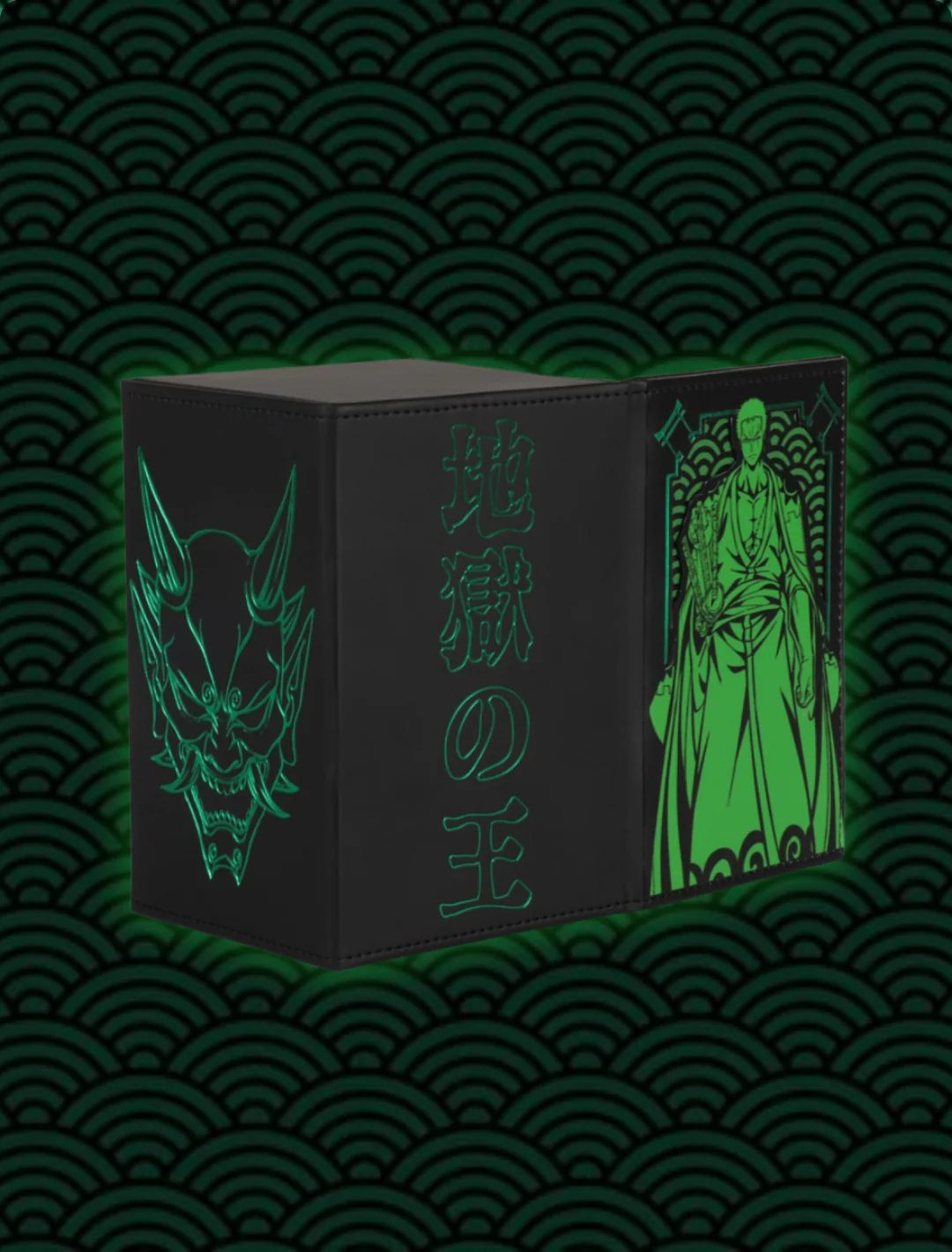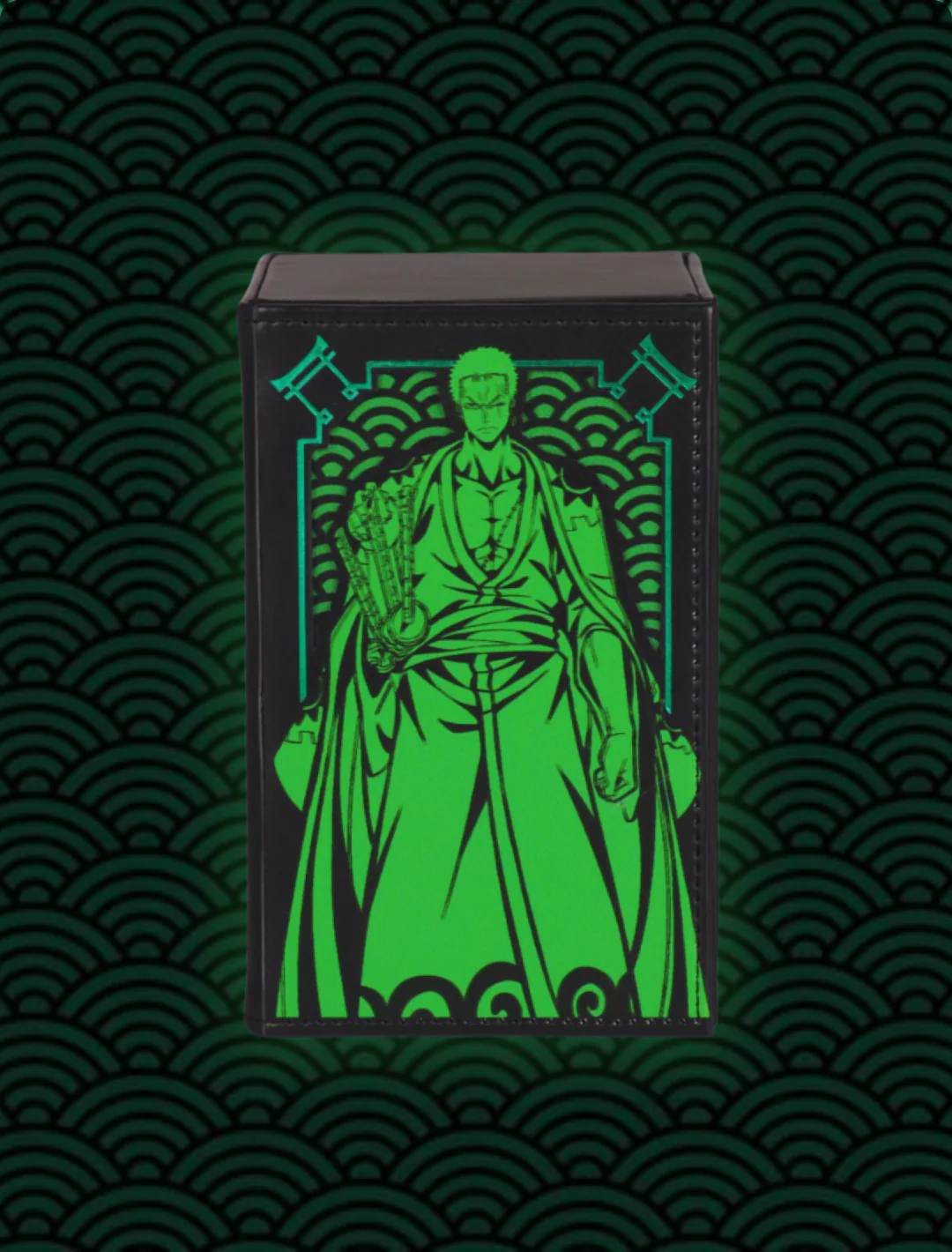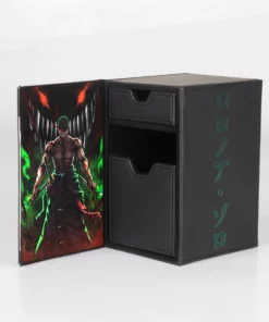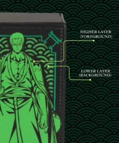 This Deckbox has a 2 layered Front Design and holo elements around it! The Upper Level which is the Pirate Hunter and a Lower Level which is the Japanese Wave!