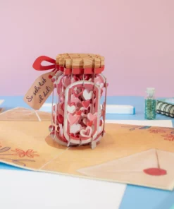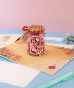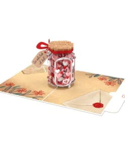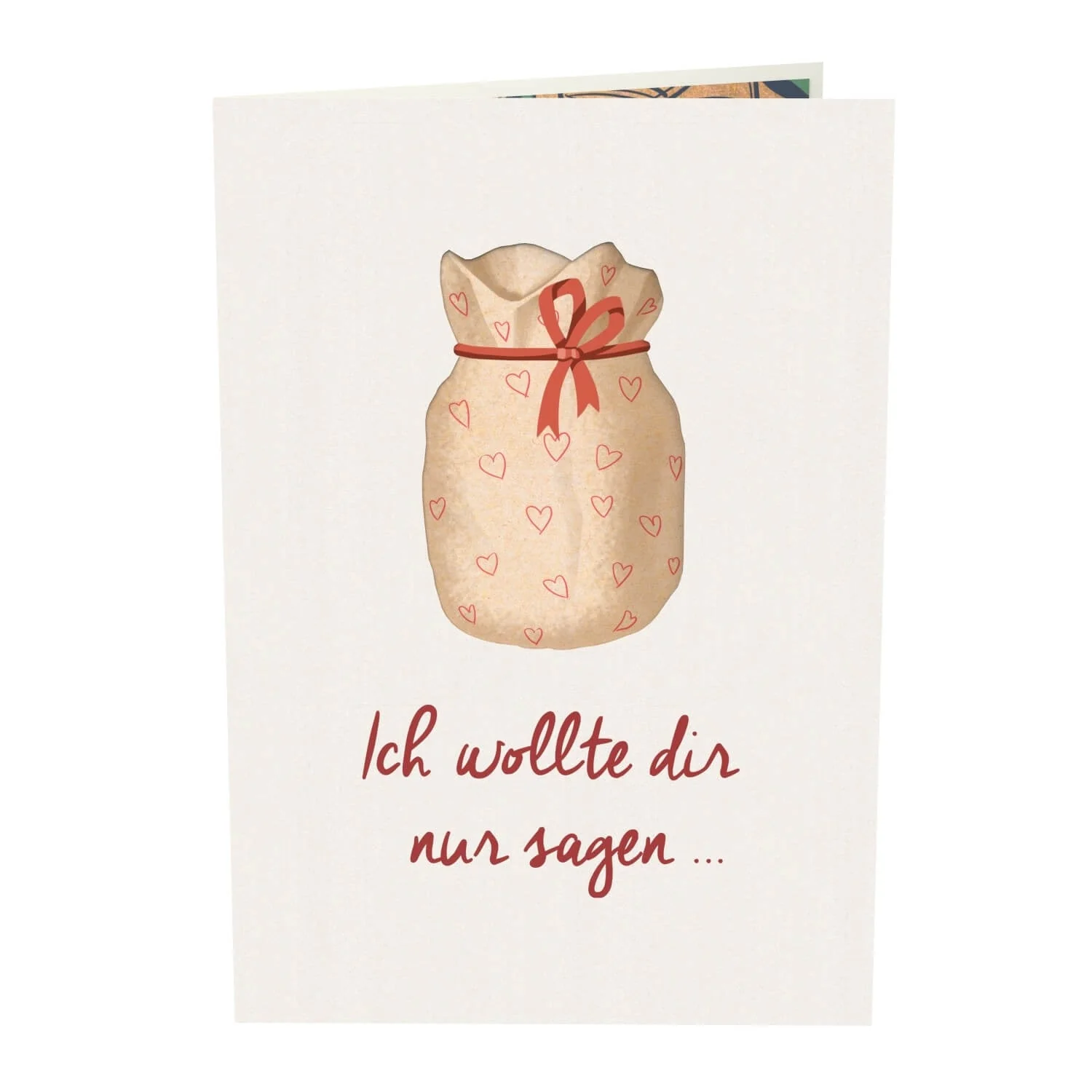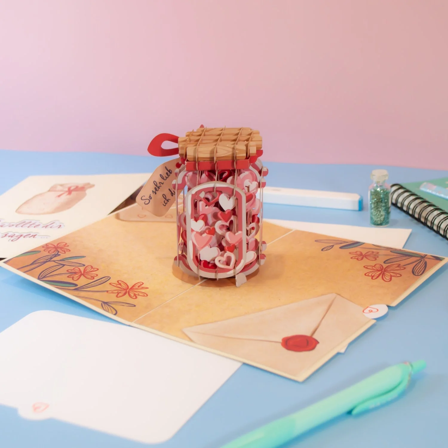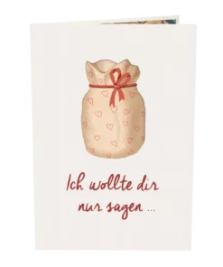 „Ich wollte dir nur sagen…“ steht auf dem Cover dieser besonderen Karte. Außerdem ist ein Geschenk – ein in Herzgeschenkpapier verpacktes Glas – abgebildet. Beim Öffnen der Pop Up Karte entfaltet sich das Geschenk: Ein Glas, bis zum Rand gefüllt mit kleinen, filigranen Herzen in Rot, Rosa und Weiß! Außerdem hängt noch eine besondere Nachricht am Glas. Auf dem Anhänger steht: „So sehr lieb ich dich“.