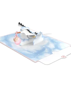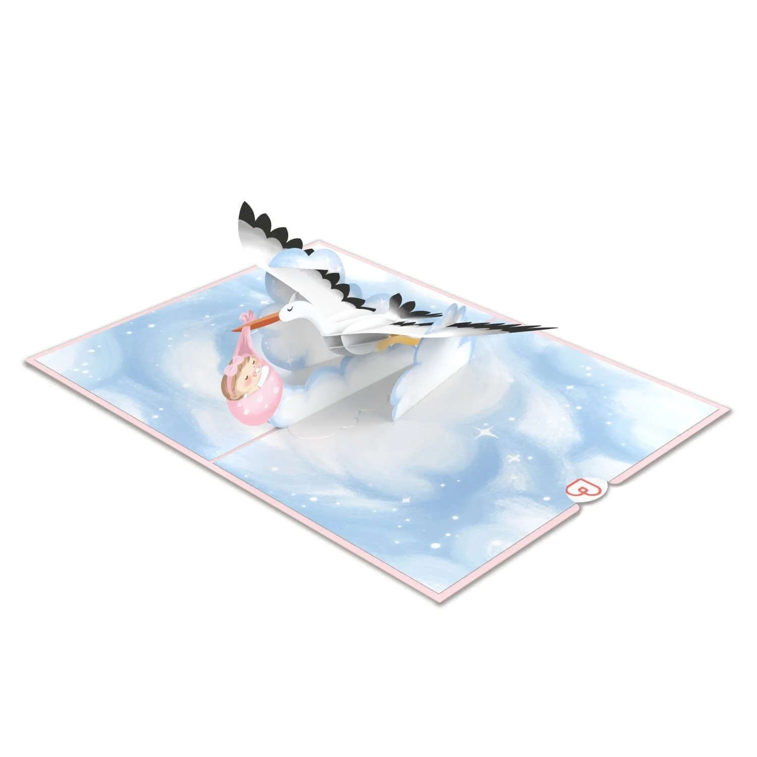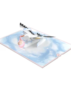 Hallo Baby! Hurra, das Baby ist das! Alles Gute zur Geburt! Herzlich Willkommen auf der Erde! Egal, was du den frisch gebackenen Eltern und ihrem Nachwuchs wünschen willst – mit unserer Baby Storch Karte bleibt es unvergessen. Beim Öffnen der Karte entfaltet sich der filigrane Storch mit rosa Babybündel im Schnabel. Er fliegt durch die Wolken und bringt den Eltern das neugeborene Baby.