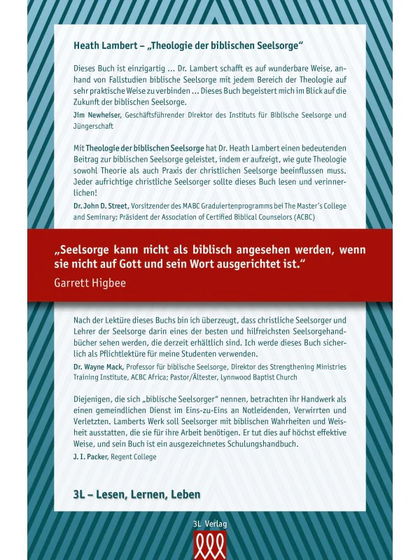 Dieses Buch ist einzigartig… Dr. Lambert schafft es auf wunderbare Weise, anhand von Fallstudien biblische Seelsorge mit jedem Bereich der Theologie auf sehr praktische Weise zu verbinden… Dieses Buch begeistert mich im Blick auf die Zukunft der biblischen Seelsorge.