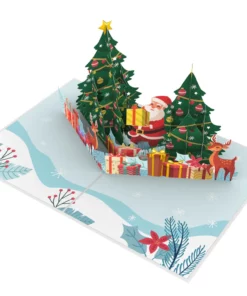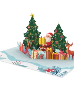 Beim Öffnen der Grußkarte entfaltet sich die wunderschöne Weihnachtsszene mit Weihnachtsmann, Rentieren, Weihnachtsbäumen und einem Meer voller Geschenken. So kommt im Handumdrehen besinnliche Weihnachtsstimmung auf!